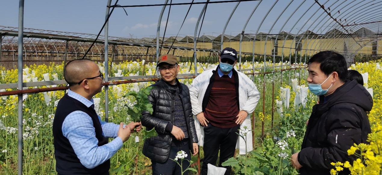 向福教授全面而详细介绍了有关富含维生素E特种油菜的深加工技术及产品开发近况,并结合两位黄州学者的疑问进行深入交流。张椿雨教授对与我校合作项目的研究进展十分满意,对项目后期工作也信心满满。随后,李世升副教授带领一行到作物育种基地查看各类种质材料。在基地,栗茂腾教授结合实物分享了在油菜种质保存与创新上的研究进展,特别介绍了萝卜味油菜苔、水果味油菜苔及抗癌型油菜苔的新型油菜品系,栗茂腾教授表示上述新型材料开发是经多年来精心研究的来之不易的科研成果,一定会助力中国乡村振兴与大健康研究。