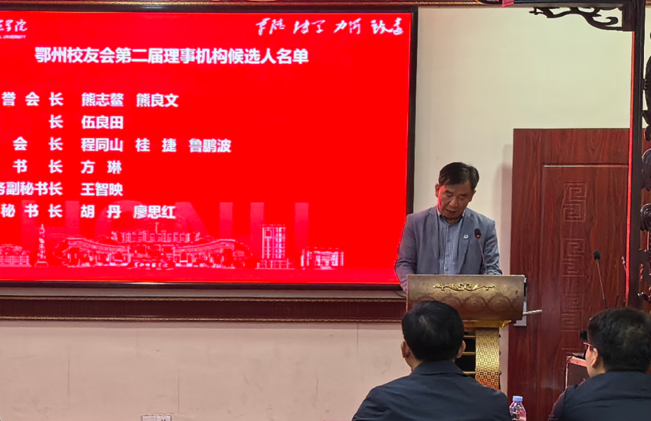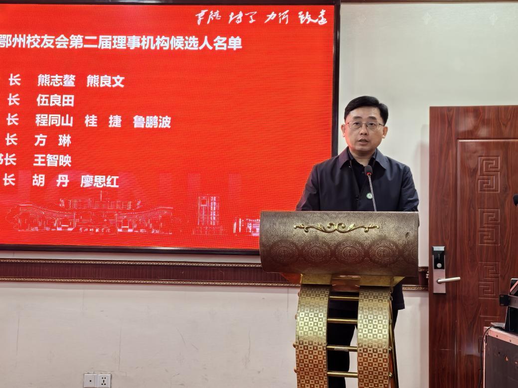 新任会长伍良田讲话表示,新一届理事会将承前启后,不辱使命,致力于将鄂州校友分会建设成为校友与校友之间、校友与母校之间紧密联系的坚实桥梁和温馨港湾,并积极整合资源,为校友成长提供助力,为母校发展贡献力量,为鄂州建设增添光彩。
