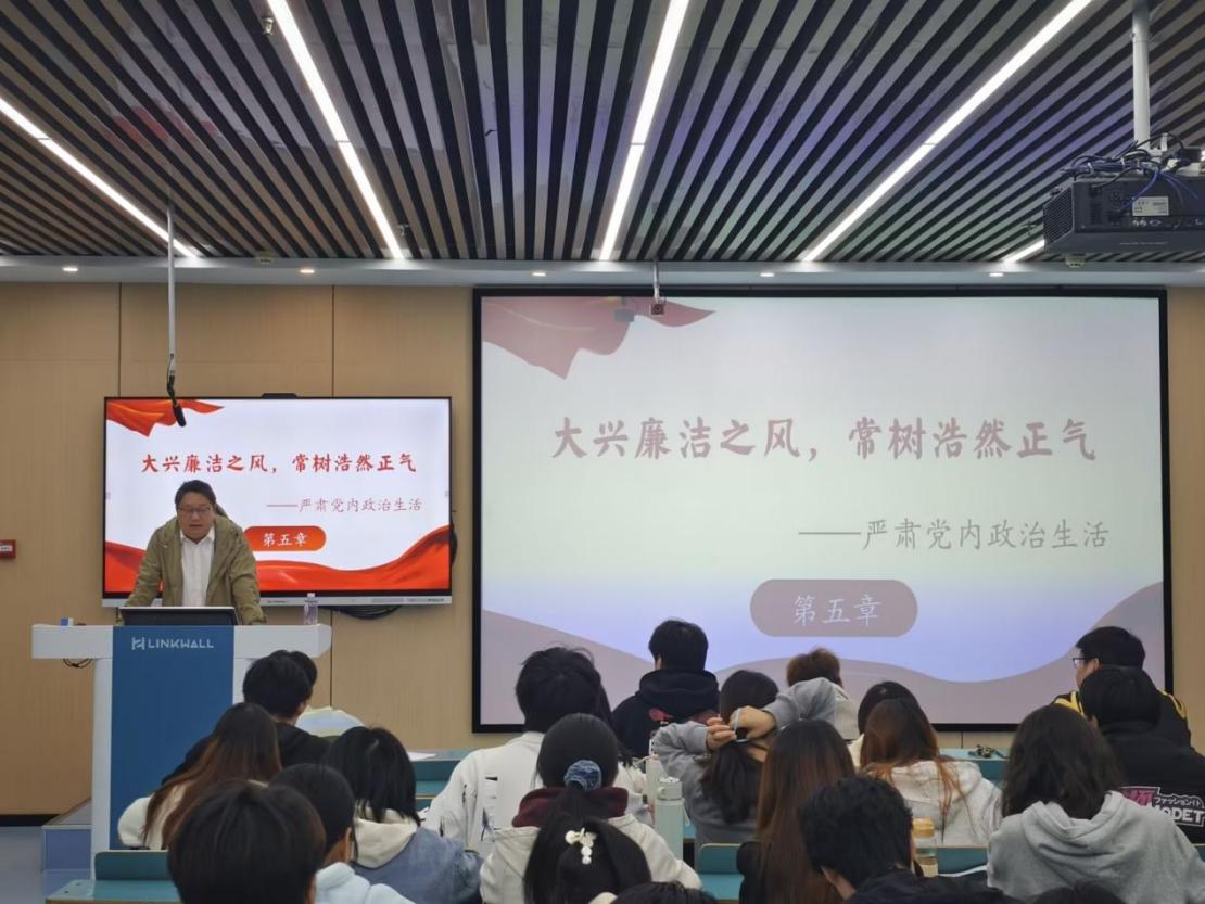 11月1日晚上18:30,机电与智能制造学院党委副书记梁开亮在逸夫楼C01主讲《大兴廉洁之风 常树浩然正气》,以违纪案例警示廉洁底线,讲解“三会一课”等党内政治生活制度。学员观《零容忍》片段并讨论,明确廉洁是必备品格。