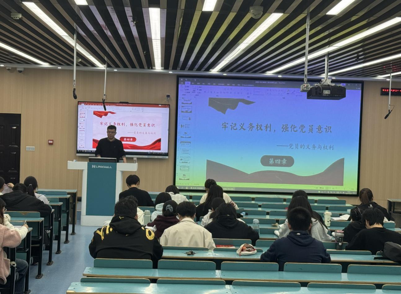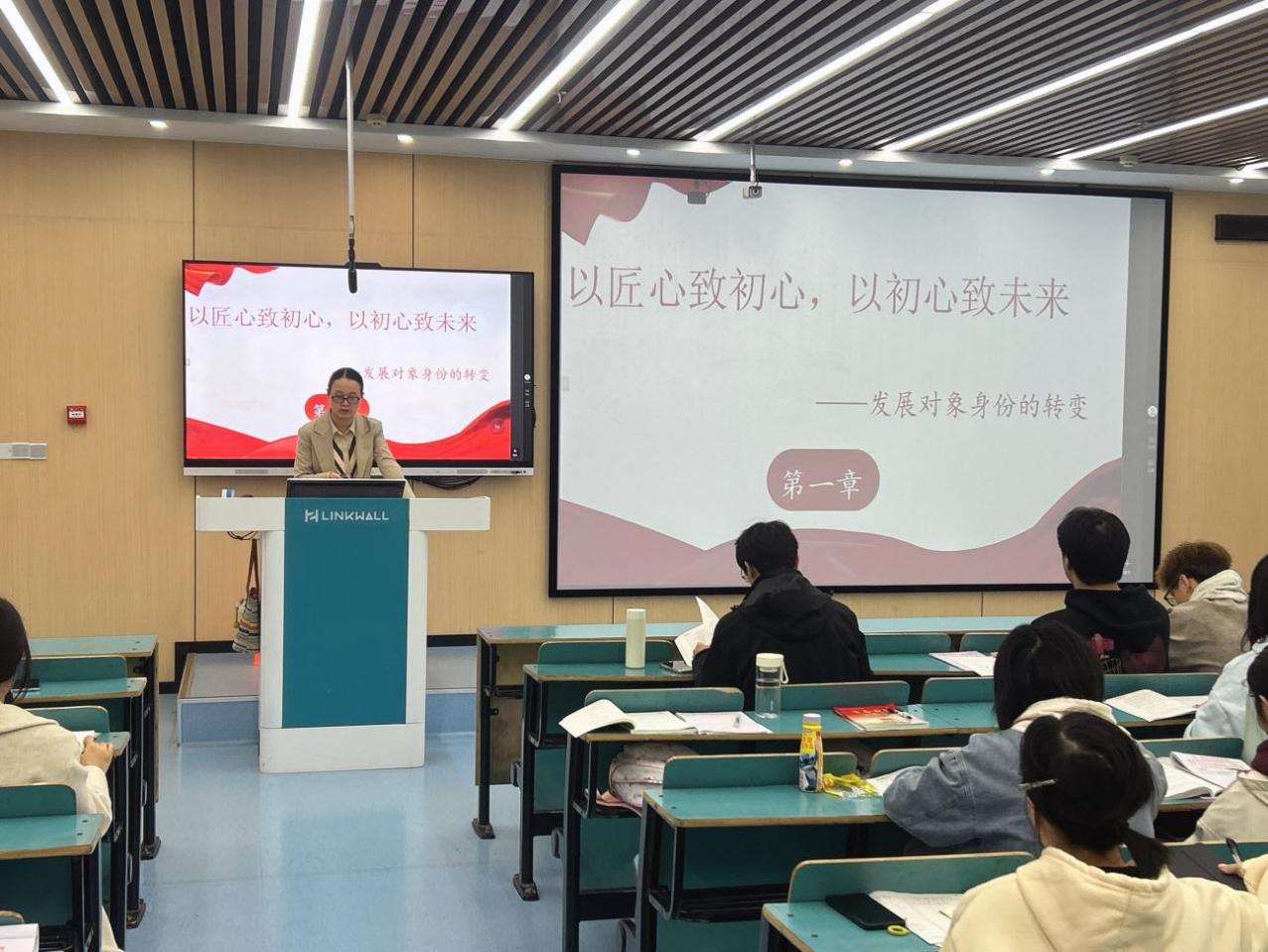 11月1日上午10:00,商学院学生第二党支部书记侯晓文在逸夫楼C01主讲《以匠心致初心 以初心致未来》,从思想、行为、责任三维度解析身份转变,讲解党的宗教工作方针与党员无神论立场要求。学员经情景模拟、案例分析,明确自身定位与纪律规矩。