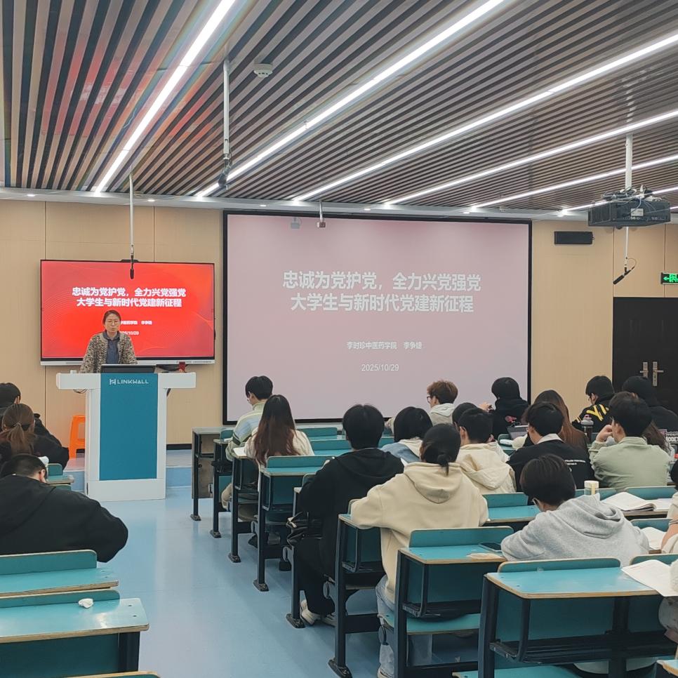 11月1日下午14:00,李时珍中医药学院党总支书记李争婕在逸夫楼C01主讲《忠诚为党护党,全力兴党强党》,解读“5+2”党建布局,结合高校实例分析基层党建任务。学员感悟“兴党强党需从自身做起”。