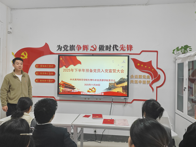 为进一步加强对新党员的培养教育、强化党员意识、坚定理想信念,充分发挥先锋模范作用,11月30日19:00,学院2025年下半年新党员入党宣誓仪式在柳一106举行。学生第一党支部书记熊维宁、学生第三党支部书记张恒启及全体下半年新接收预备党员参加。本次仪式由学生第三党支部书记张恒启主持。