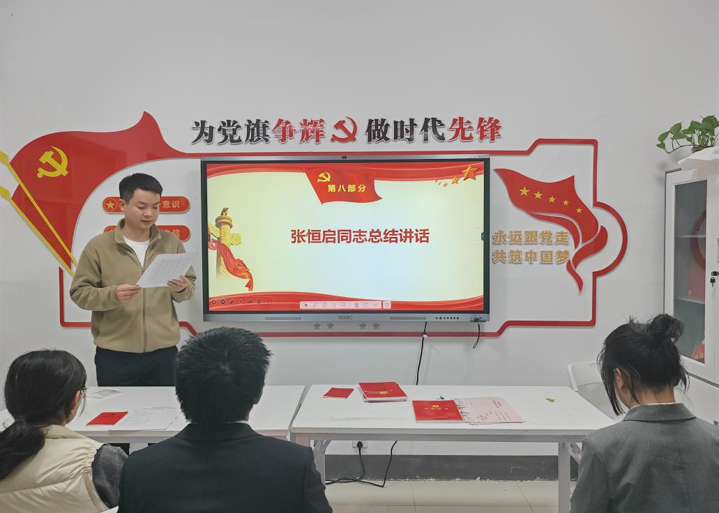 第八项,由学生第三党支部书记张恒启同志进行总结讲话。他首先对各位光荣成为预备党员的同志表示热烈祝贺。同时向大家提出了几点希望:要坚定理想信念,终生不懈;要践行党的宗旨,担当作为;要严守党的纪律,锤炼党性。他鼓励新党员以更高的标准严格要求自己,在各自的岗位上奋发有为,为我们党的事业,为国家的发展和人民的幸福贡献全部力量。