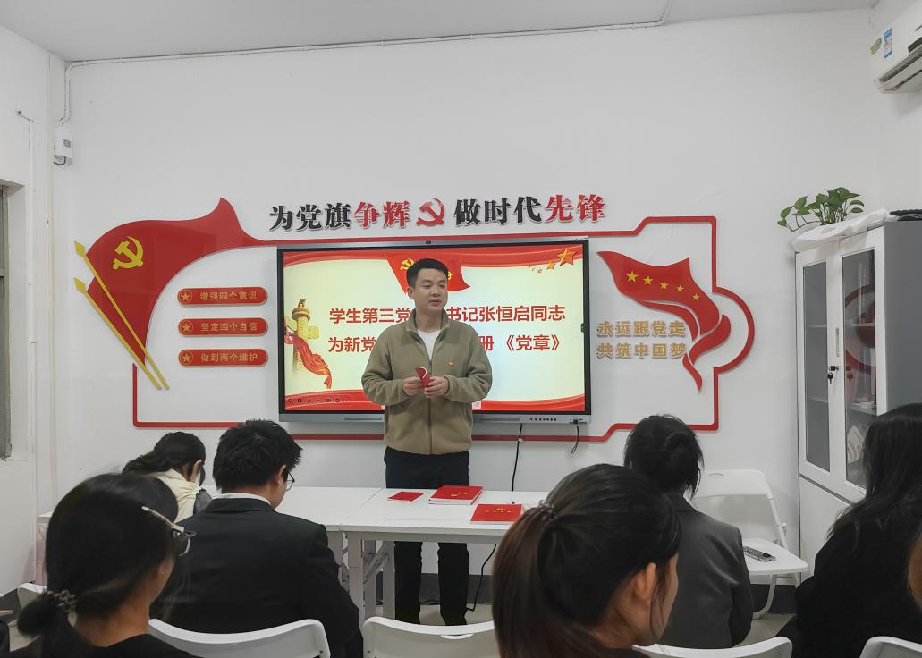 第四项,由学生第三党支部书记张恒启同志为新党员发放《党章》和党员手册。