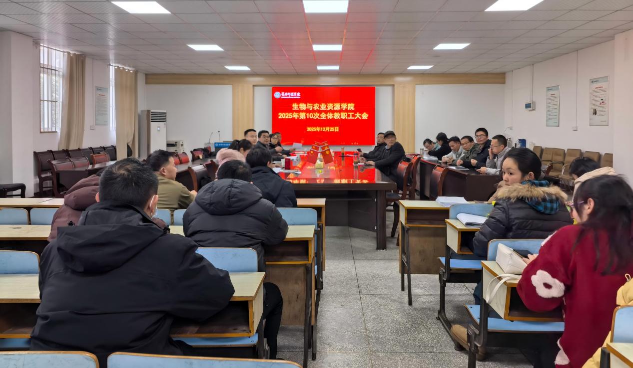 12月25日,学院在生物楼合01会议室召开2025年秋季学期第4次全体教职工大会。院党委书记闵艳林主持会议并讲话,院长肖云丽等院领导及全体教职工参会。